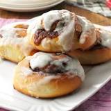 - Mix brown sugar and cinnamon. Punch down dough; divide in half. On a lightly floured surface, roll one portion into an 11×8-in. rectangle. Brush with 2 tablespoons butter; sprinkle with half of the brown sugar mixture to within 1/2 in. of edges. Roll up jelly-roll style, starting with a long side; pinch seam to seal. Cut into eight slices; place in a greased 13×9-in. pan, cut side down. Cover with a kitchen towel. Repeat with remaining dough and filling. Let rise in a warm place until doubled, about 1 hour. Preheat oven to 350°.