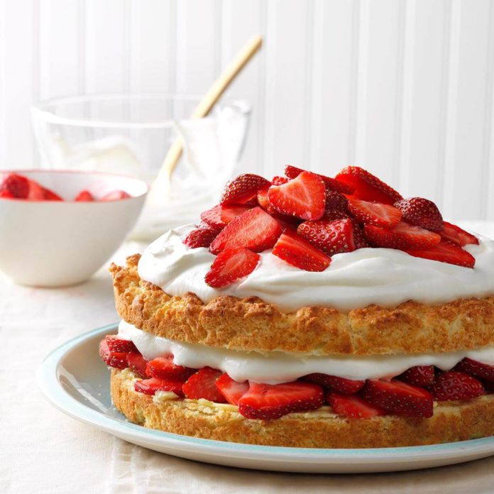 - Beat heavy cream until it begins to thicken. Add confectioners’ sugar and vanilla; beat until stiff peaks form. Split cake in half crosswise; butter bottom layer. Spoon half the strawberries over bottom layer. Spread with some whipped cream. Cover with top cake layer. Top with remaining berries and whipped cream. Cut into wedges.